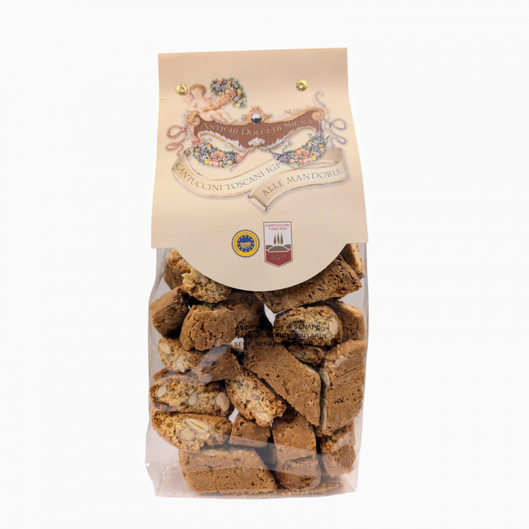 Caratteristiche: I Cantuccini sono biscotti secchi e croccanti, tagliati ancora caldi per ottenere la loro caratteristica forma obliqua. Seguono la ricetta tradizionale senese, offrendo un gusto autentico e un deciso retrogusto di mandorle e uova.