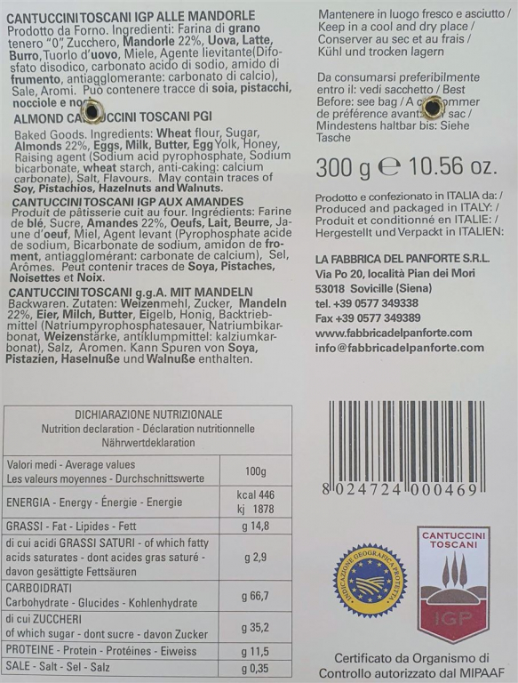 Ingredienti Chiave: Farina di grano tenero "0", Zucchero, Mandorle (22-26%) rigorosamente intere e non pelate, Uova, Burro e Miele (materie prime di alta qualità lavorate artigianalmente).