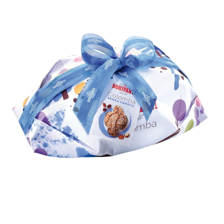 Soffice impasto senza frutta candita ma ricco di uvetta, ricoperto di croccante glassa alle nocciole, guarnita di mandorle e granella di zucchero.