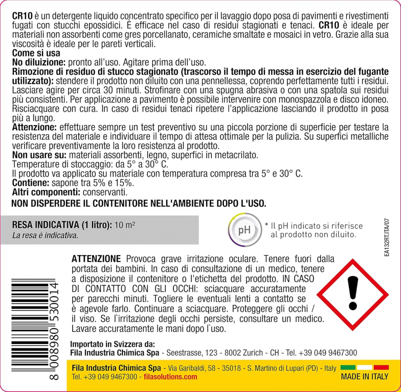 - Fila Cr10 È Un Detergente Liquido ad Alta Viscosità Che Riesce a Rimuovere Aloni, Macchi e Residui di Stucco Epossidico