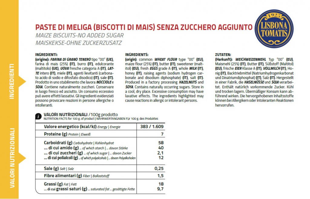 ingredienti: farina di grano tenero tipo “00”, farina di mais (25%), burro, edulcorante (maltitolo), uova fresche categoria A, latte intero, miele, agenti lievitanti (difosfato disodico e carbonato acido di ammonio), sale. Prodotto in uno stabilimento che lavora nocciole. Conservare in luogo fresco ed asciutto. Un consumo eccessivo può avere effetti lassativi.