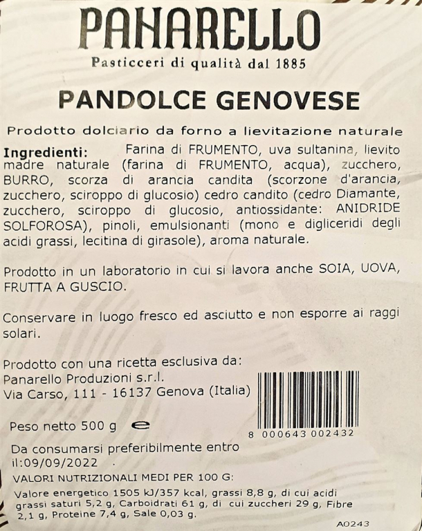 Ingredienti Farina di frumento, uva sultanina, burro, zucchero, latte, scorza di arancia candita (scorzone d’arancia, zucchero, sciroppo di glucosio derivante esclusivamente da mais), cedro candito (scorza di cedro, zucchero, sciroppo di glucosio derivante esclusivamente da mais, contiene anidride solforosa), tuorlo d’uovo, nocciole, marsala, polvere lievitante (difosfato disodico, carbonato acido di sodio, amido frumento), pinoli. Il prodotto può contenere tracce di: soia, altra frutta a guscio, arachidi e prodotti a base di arachidi.