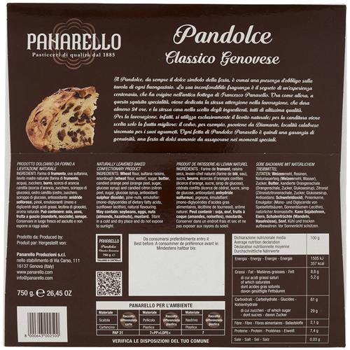 Panarello Pandolce classico genovese è un'icona della pasticceria ligure, un dolce tradizionale che incarna la storia e i sapori della città. Prodotto dalla storica Pasticceria Panarello, questo pandolce si distingue per la sua consistenza compatta e per la ricchezza degli ingredienti, che lo rendono un caposaldo delle feste e delle occasioni speciali.