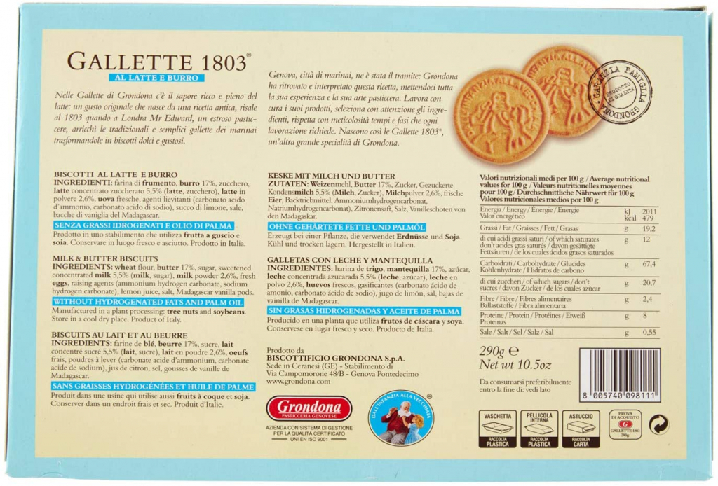 L’estro non ha bisogno di pennelli. Era il 1803 quando Mr. Edward, eccentrico panettiere londinese, guardò le gallette dei marinai e vide i dolci burrosi e ricchi di latte che da quel momento avrebbero reso l’ora del the un’occasione ancora più deliziosa. Nel 1920 Orlando Grondona riscrive con le sue regole di qualità la ricetta di Mr.Edward e la inserisce nel quadernetto nero delle cose buone. Da quel momento anche in Italia la Galletta è diventata un irrinunciabile ingrediente della colazione. Nelle Gallette Grondona c'è il sapore ricco e pieno del latte, burro puro e farine selezionate. Una dolcezza pret à porter grazie alle monoporzioni scelte per farvi meglio indulgere a improvvisi quanto benefici pensieri di golosità.