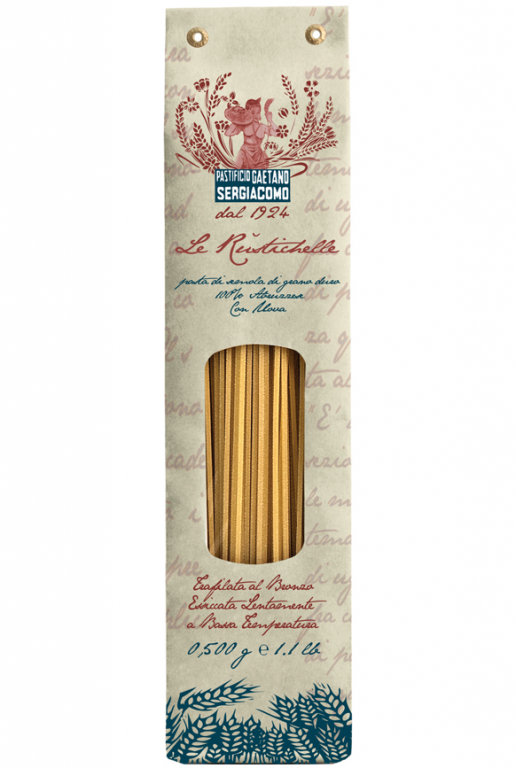 Un formato tipico della tradizione culinaria abruzzese, realizzato con uova 100% di galline allevate a terra, senza l’impiego di acqua, trafilate al bronzo ed essiccate a bassa temperatura (qui col package classico in carta kraft). Presentano una texture dalla ruvidezza eccezionale, visibile anche ad occhio nudo. Consigliamo l’abbinamento con dei sughi corposi rossi, come il sugo “alla Pecorara”, “Amatriciana”, “Ortolana” o “Salsiccia” di Rustichella d’Abruzzo.