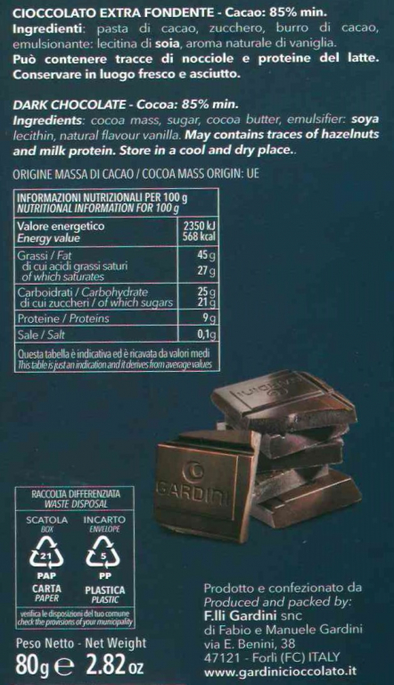 INGREDIENTI: cacao in pasta, zucchero, burro di cacao, emulsionante: lecitina di soia, aroma naturale di vaniglia. Cacao: 85% min.