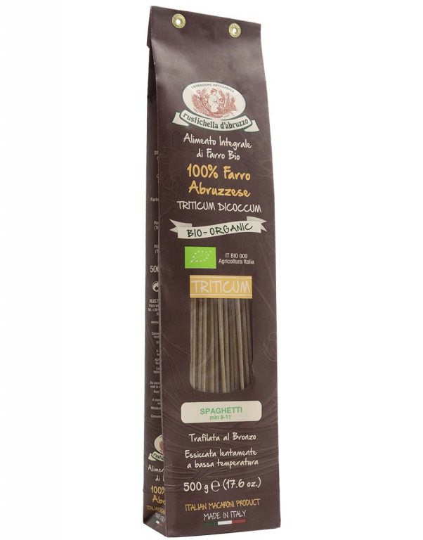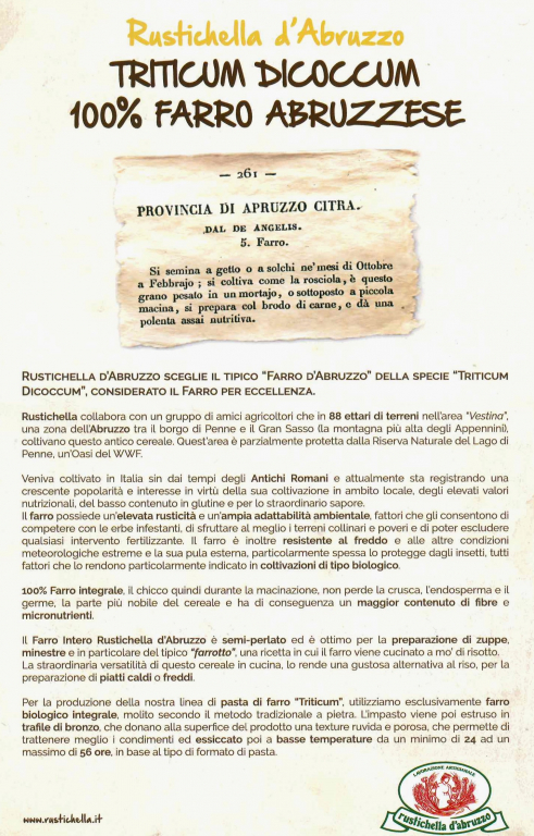 SPAGHETTI DI FARRO BIO 500 G FARRO BIOLOGICO L’esordio della linea di farro Rustichella d’Abruzzo risale al 1991, anno in cui il nostro prodotto fu eletto novità dell’anno in Italia e segnò un record di vendite negli Stati Uniti d’America, a seguito di un articolo sulle peculiarità del farro apparso sul New York Times.