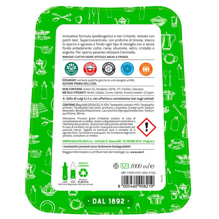 Innovativa formula ipoallergenica e non irritante, testata con patch test. Superconcentrata, con profumo di limone, stacca lo sporco e sgrassa a fondo ogni tipo di stoviglia con e senza fondo antiaderente: cotto, rame, alluminio, vetro, cristallo o argento. Per sporco pesante utilizzare l’ammollo.