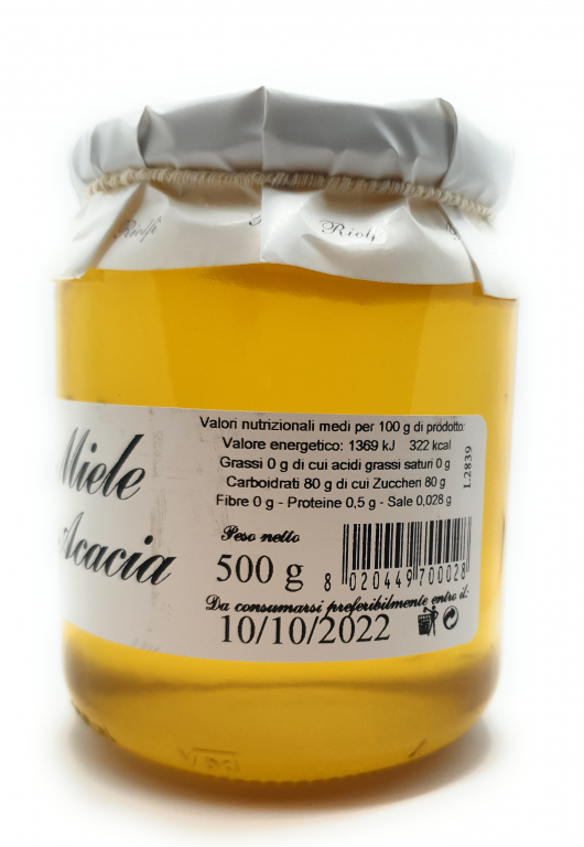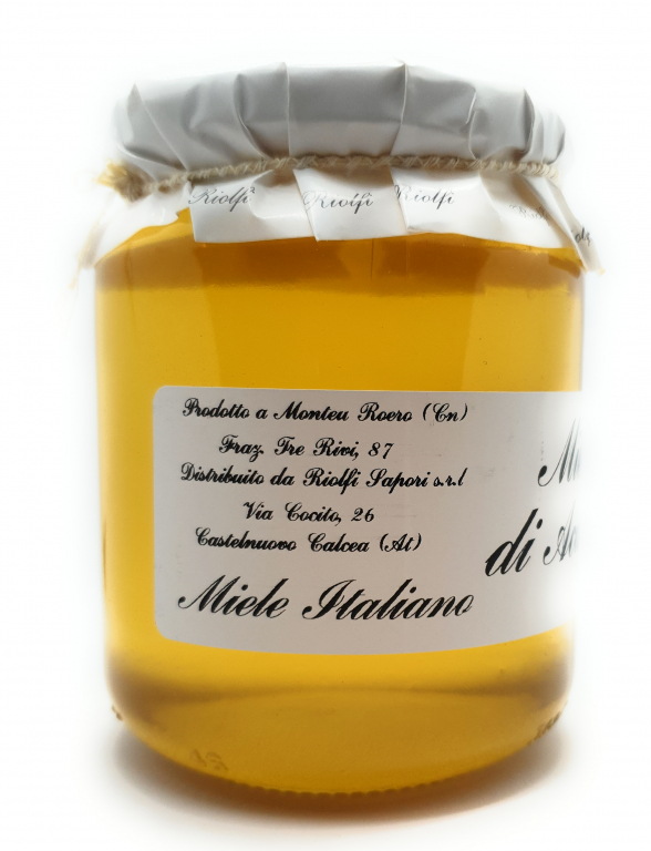 Produttore: Riolfi Sapori. Sede: Castelnuovo Calcea (AT), Piemonte, Italia. Tipologia: Miele di acacia monoflorale. Formato: Vaso in vetro da 500 g. Ingredienti: Miele di acacia. Allergeni: ASSENTI.