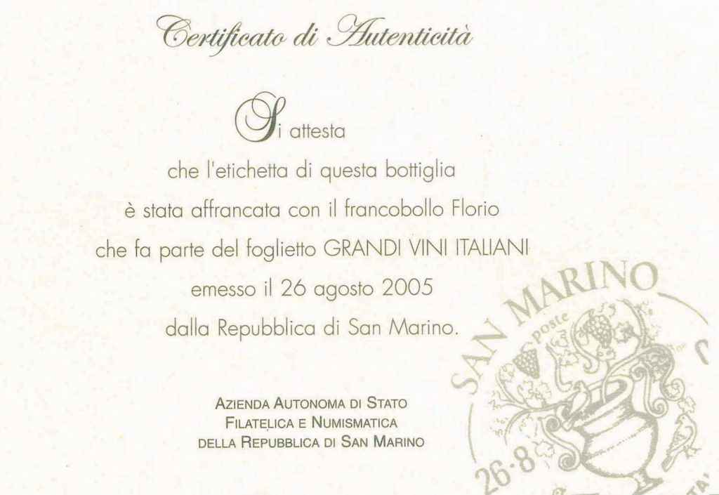 Edizione speciale contenente una bottiglia dell'annata 2000 + annullo filatelico Repubblica di San Marino serire "I GRANDI VINI ITALIANI"
