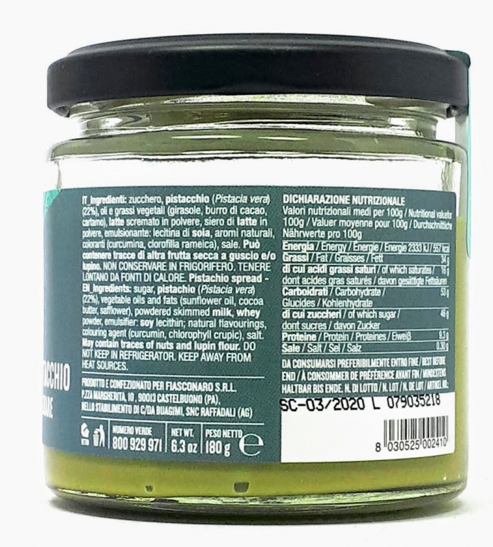 Ingredienti: zucchero, pistacchio (Pistacia vera 22%),grassi vegetali (girasole, burro di cacao, latte scremato in polvere , siero di latte polvere, emulsionante: lecitina di soia, aromi naturali, coloranti (curcumina, clorofilla rameica), sale.