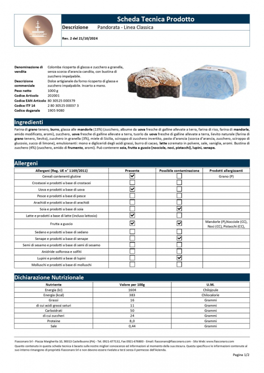 Produttore: Fiasconaro (Castelbuono, Sicilia). Tipologia: Dolce pasquale a lievitazione naturale (Senza canditi e uvetta). Formato: Confezione da 900 g. Caratteristiche e Benefici: