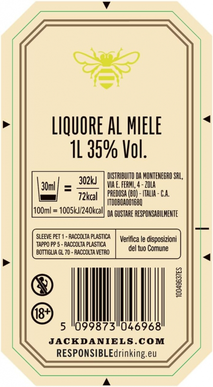 Produttore: Jack Daniel Distillery (Lynchburg, Tennessee). Tipologia: Liquore al Whiskey. Ingredienti: Blend di Jack Daniel’s Tennessee Whiskey e un esclusivo liquore al miele di produzione propria. Gradazione Alcolica: 35% Vol. Formato: Bottiglia da 1 Litro.