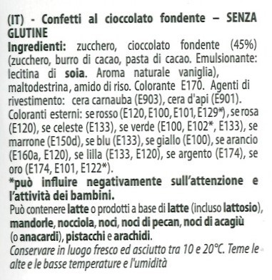 Zucchero, cioccolato fondente (45%) (zucchero, burro di cacao, pasta di cacao. Emulsionante: lecitina di soia. Aroma naturale di vaniglia), amido di riso, maltodestrina. Colorante: E170. Agenti di rivestimento: cera carnauba (E903), cera d'api (E901).