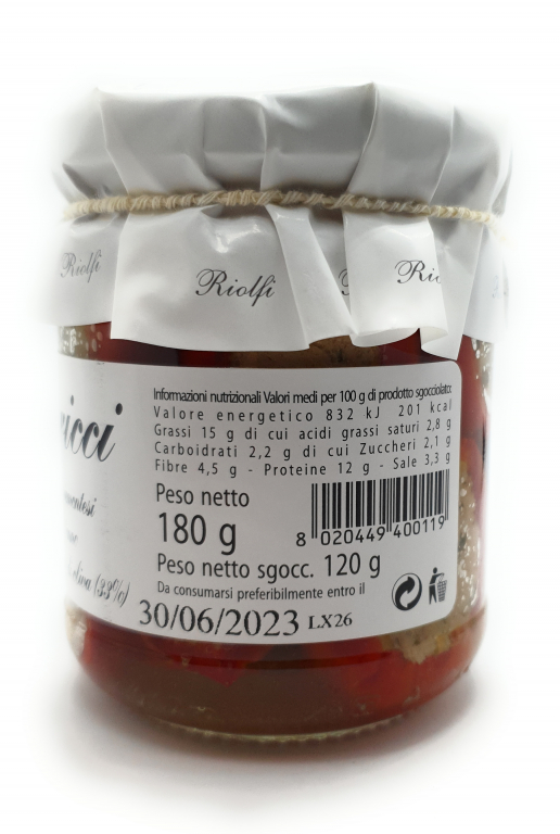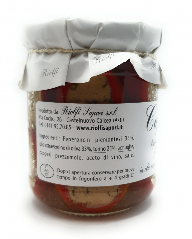 Produttore: Riolfi Sapori. Sede: Castelnuovo Calcea (AT), Piemonte, Italia. Tipologia: Specialità gastronomica in olio (Peperoni farciti). Formato: Vasetto in vetro da 180 g. Ingredienti: Peperoncini piemontesi 35%, olio extravergine d'oliva, TONNO 25%, ACCIUGHE, capperi, prezzemolo, aceto di vino, sale. Allergeni: PESCE (TONNO, ACCIUGHE). Può contenere tracce di SEDANO.