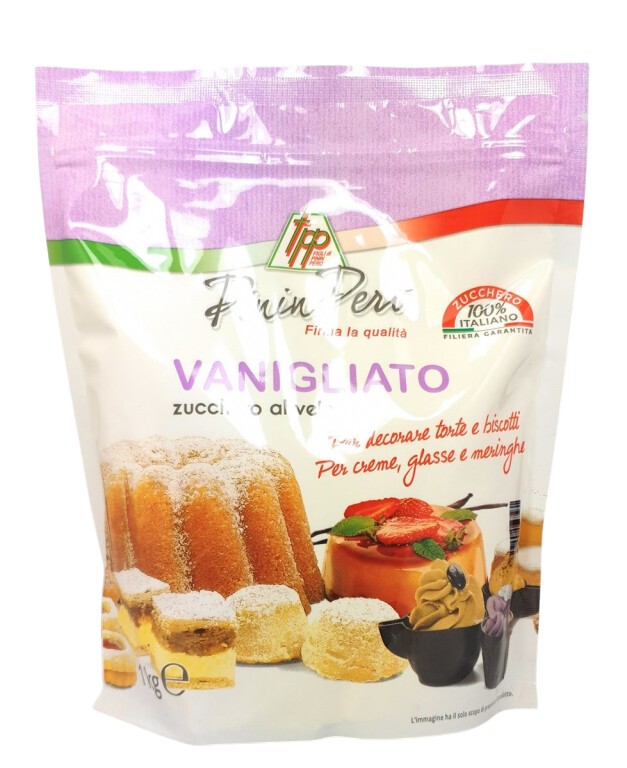 Produttore: Pinin Pero & C. S.p.A. Sede: Nizza Monferrato (AT), Piemonte, Italia. Tipologia: Zucchero al velo aromatizzato. Formato: Confezione da 1 kg. Ingredienti: Zucchero, amido di mais (3%), aromi. Allergeni: Assenti. Senza glutine. Caratteristiche e Benefici: