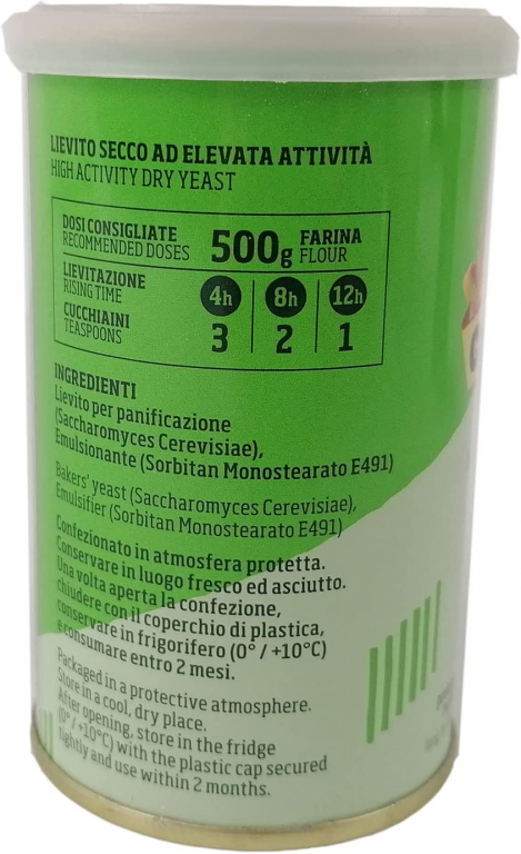 DOSI DI UTILIZZO: 1/3 rispetto al lievito fresco. INGREDIENTI: lievito per panificazione (Sharomyces Cerevisiae), Emulsionante (Sorbitan Monostearato E491).