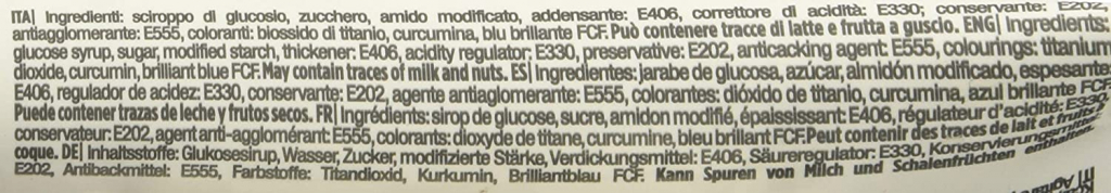 Verde: Sciroppo di glucosio, zucchero, amido modificato, addensante: E406, correttore di acidità: E330; conservante: E202, antiagglomerante: E555, coloranti: biossido di titanio, curcumina, blu brillante FCF. Può contenere tracce di latte e frutta a guscio.