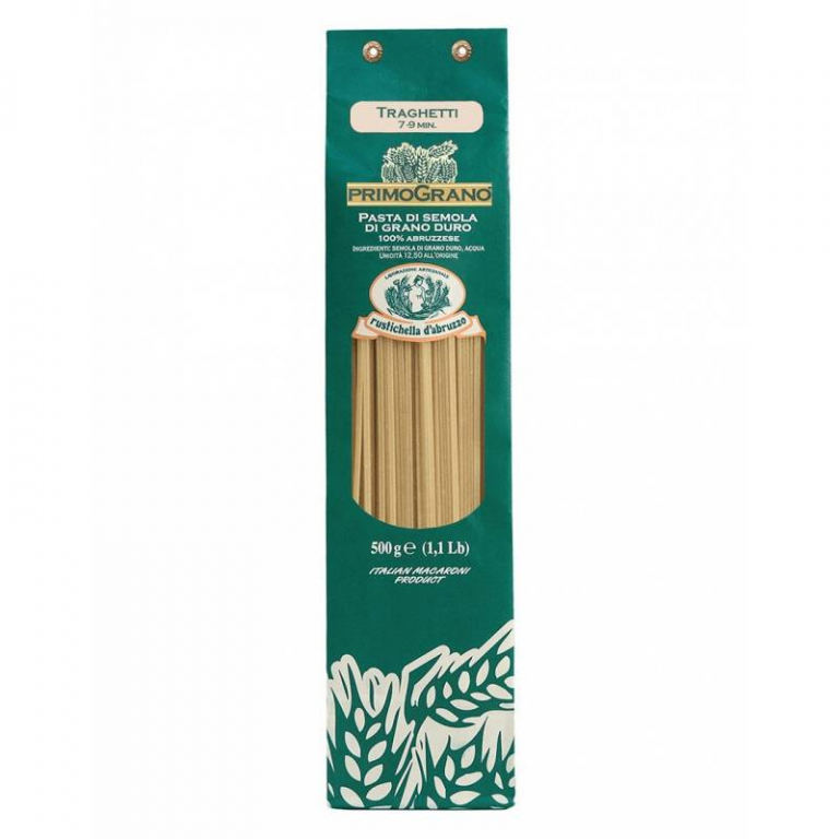 Con una sezione triangolare, il Traghetto è realizzato con semole di grano duro 100% abruzzese, trafilato al bronzo ed essiccato a bassa temperatura. E' un formato particolare che si abbina molto bene a condimenti bianchi di pesce oppure ad un bel ragù fatto in casa. I sughi ai "Funghi Porcini" e "Bianco alla Salsiccia" di Rustichella d'Abruzzo rappresentano due ulteriori abbinamenti che vi consigliamo di provare. Tempo di cottura: 9-11 minuti.