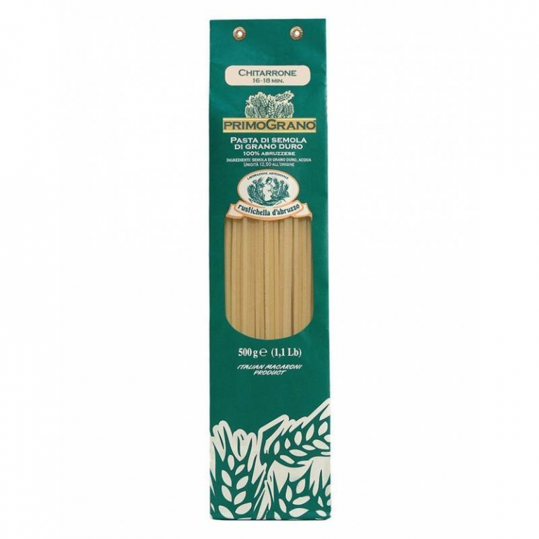 Formato simile agli spaghetti ma con uno spessore maggiore e una sezione quadrata invece che rotonda, che deriva dall’attrezzo tipico utilizzato per la sua preparazione (chiamato appunto “chitarra”), il quale conferisce a questa pasta una texture decisa in grado di catturare completamente il condimento, che può spaziare da un semplice ma buonissimo pomodoro e basilico, ad uno più corposo e rustico come salsiccia e radicchio fino ad uno più “healthy” come il “pesto alla Genovese” Rustichella d’Abruzzo. Tempo di cottura: 16-18 minuti.