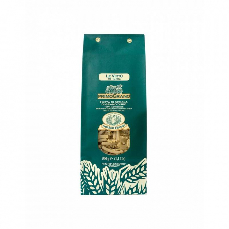 Questo formato di pasta “mista” artigianale nasce e si sviluppa nella terra d’Abruzzo, in particolare a Teramo, dove già nel 1800 le massaie pulivano le credenze dai resti degli alimenti preparati durante l’inverno, cucinando un “piatto unico abbondante” con prodotti come legumi, vari tipi di pasta secca, verdure fresche, prosciutto crudo e uova, con l’intento di lasciarsi alle spalle l’inverno e festeggiare l’inizio della primavera. LE VIRTU’ si sposano bene anche con il sugo alla Pecorara Rustichella d’Abruzzo. Tempo di cottura: 10-12 minuti.