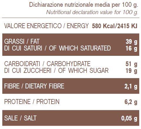 INGREDIENTI Farina di frumento, burro, nocciole tostate varietà Tonda Gentile Trilobata 25%, zucchero semolato, aroma naturale vaniglia. Farcitura 28%: zucchero, oli vegetali (olio di girasole, burro di cacao), pasta di nocciole 14%, latte scremato in polvere, cacao magro in polvere 7%, emulsionante lecitina di soia, aromi naturali.