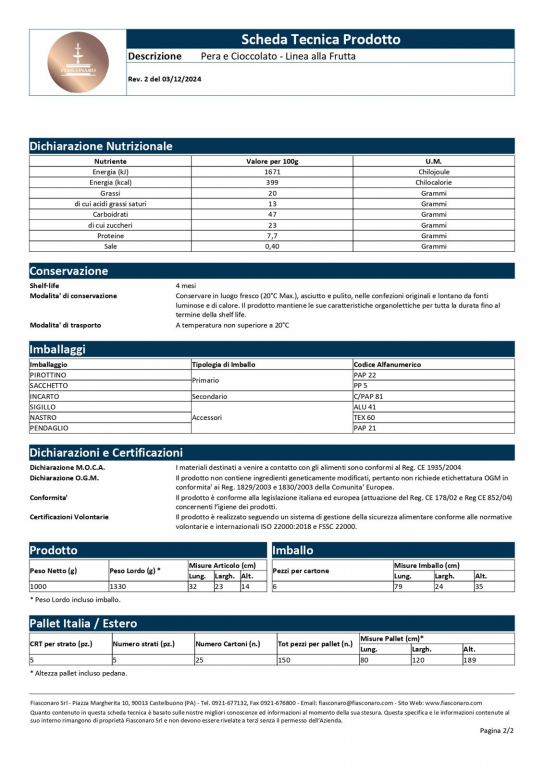 Produttore: Fiasconaro (Castelbuono, Sicilia). Tipologia: Dolce pasquale a lievitazione naturale con frutta e cioccolato. Formato: Confezione da 1 kg. Ingredienti: Farina di grano tenero, burro, zucchero, uova fresche, pere candite (pere, sciroppo di glucosio-fruttosio, zucchero), gocce di cioccolato (zucchero, pasta di cacao, burro di cacao, emulsionante: lecitina di girasole, aroma naturale di vaniglia), lievito naturale, pasta di nocciola, miele di Sicilia, zucchero invertito, emulsionante: mono e digliceridi degli acidi grassi, burro di cacao, latte scremato in polvere, sale, aromi naturali: bacche di vaniglia. Glassa: zucchero, albume d’uovo fresco, farina di riso, farina di nocciole, amido modificato, aromi. Allergeni: Grano (glutine), latte, uova, nocciole. Può contenere tracce di altra frutta a guscio e soia.
