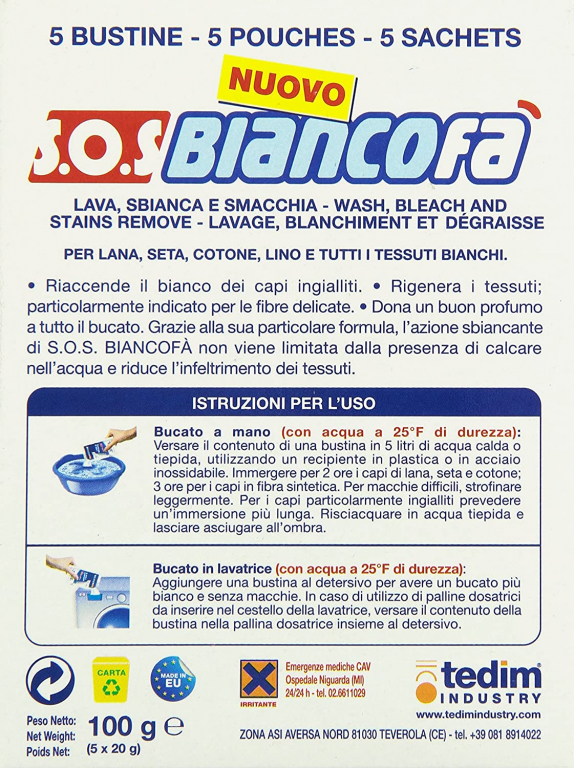 Produttore: Biancofà. Tipologia: Additivo sbiancante per bucato. Formato: Scatola da 5 buste monodose. Caratteristiche e Benefici: