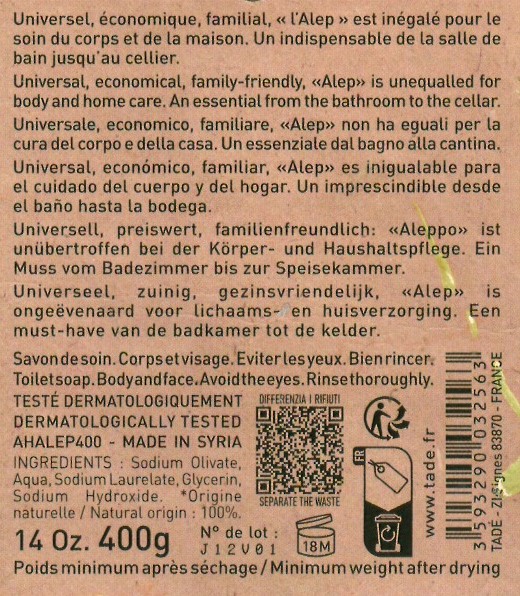Produttore: Tadé Pays du Levant. Sede: Francia (produzione artigianale secondo tradizione siriana). Tipologia: Sapone solido naturale. Formato: Cubo da 400 g. Ingredienti: Olio di oliva (Olea Europaea Fruit Oil), olio di bacche d'alloro (Laurus Nobilis Fruit Oil), acqua, idrossido di sodio. Allergeni: ASSENTI (non contiene profumi sintetici, coloranti o conservanti).