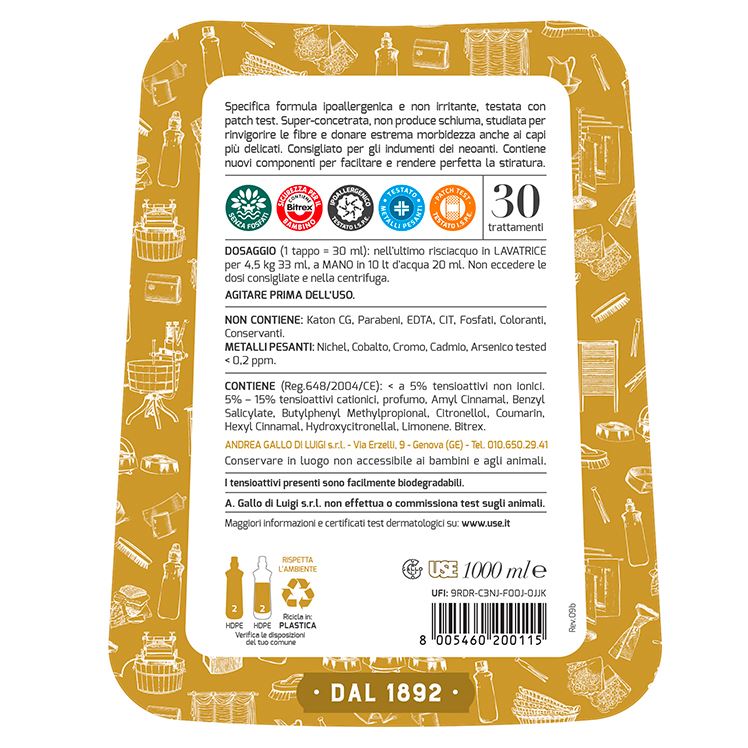 Specifica formula ipoallergenica e non irritante, testata con patch test. Superconcetrata, studiata per rinvigorire le fibre e donare estrema morbidezza anche ai capi più delicati. Consigliato per indumenti dei neonati. Contiene nuovi componenti per facilitare e rendere perfetta la stiratura