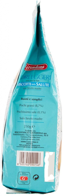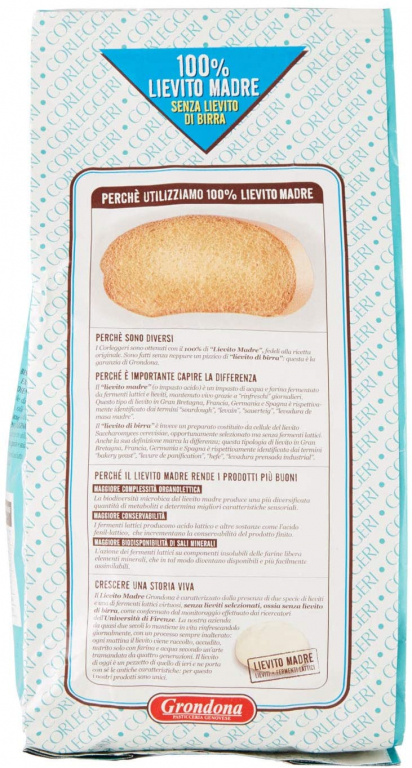Farina di frumento, lievito naturale da madre bianca Grondona (farina di frumento, acqua), zucchero, olio extravergine d’oliva spremuto a freddo italiano 7%, tuorlo d’uovo da galline allevate a terra, malto d’orzo.