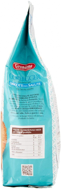 Valore energetico 1771/419 kJ/ kcal , Grassi 8,4 g di cui acidi grassi saturi 1,7 g di cui acidi grassi monoinsaturi 5,1 g, carboidrati 72,7 g di cui zuccheri 14,7 g, fibre 2,5 g, proteine 12,00 g, sale 0,01 g.