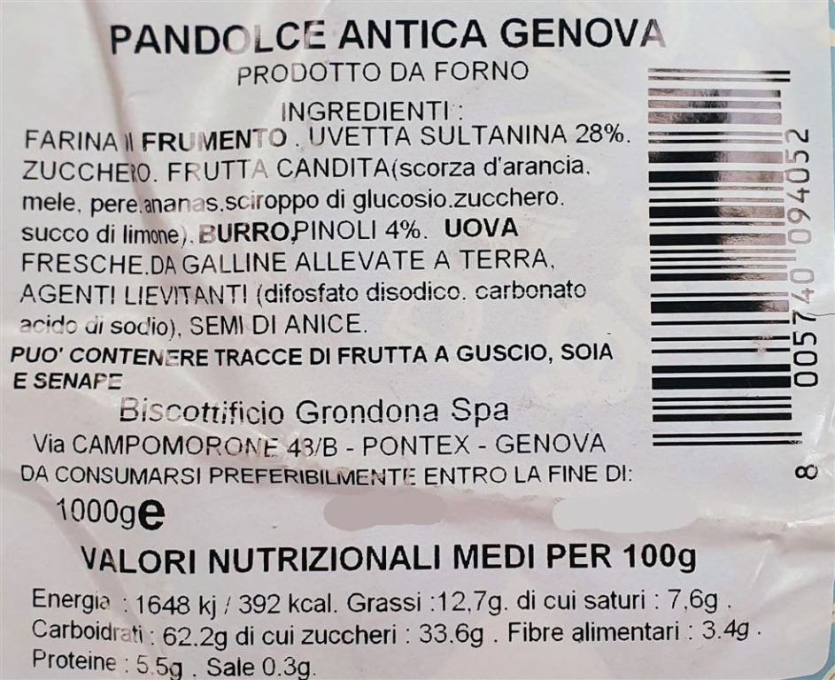 Farina di frumento, uvetta sultanina 28%, zucchero, burro, frutta candita (scorza arancia, mele, pere, ananas, sciroppo di glucosio-fruttosio, zucchero, succo di limone), pinoli 4%, uova fresche, agenti lievitanti (difosfato disodico, carbonato acido di sodio), semi di anice. SENZA GRASSI IDROGENATI Contiene: frumento, derivati del latte, uova. Prodotto in uno stabilimento che utilizza frutta a guscio e soia. Conservare in luogo fresco ed asciutto. Prodotto in Italia.