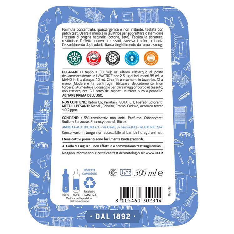 dà corpo ai tessuti, restituisce l’aspetto del nuovo, facilita la stiratura, ravviva i colori, il tessuto rimane pulito più a lungo, rallenta l’assorbimento degli odori, ritarda l’ingiallimento da fumo e smog.