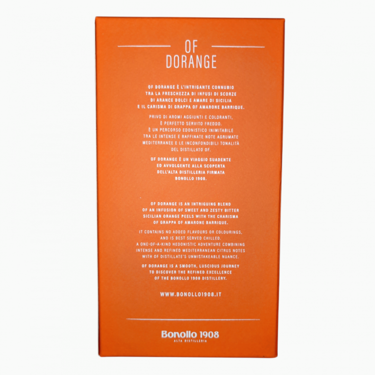 Per la prima volta l’unicità di Grappa Of Amarone Barrique scopre uno stuzzicante profumo del mondo mediterraneo: le scorze scelte di pregiate Arance di Sicilia. Un incontro straordinario, che fa nascere un liquore altrettanto straordinario: aristocratico, vellutato, di forte personalità senza aromi aggiunti. Un carattere autentico dove le note inconfondibili dell’Of Amarone Barrique si sposano con l’intensa solarità siciliana. Non avete mai assaggiato un’Of così.