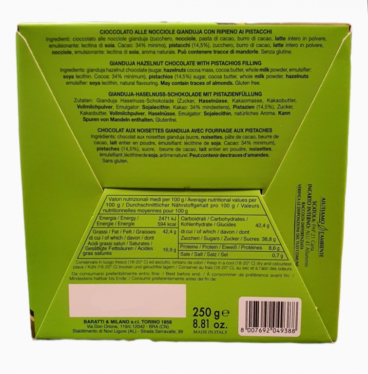 CIOCCOLATO ALLE NOCCIOLE GIANDUJA (ZUCCHERO, NOCCIOLE, PASTA DI CACAO, BURRO DI CACAO, LATTE INTERO IN POLVERE, EMULSIONANTE: LECITINA DI SOIA. CACAO: 34% MINIMO), PISTACCHI (14,5%), ZUCCHERO, BURRO DI CACAO, LATTE INTERO IN POLVERE, EMULSIONANTE: LECITINA DI SOIA, AROMA NATURALE. PUÒ CONTENERE TRACCE DI MANDORLE. SENZA GLUTINE.