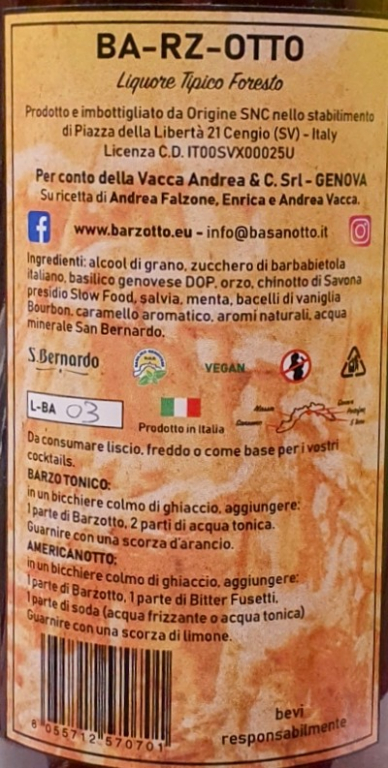 Ingedienti: alcool di grano, zucchero di barbabietola italiano, basilico genovese DOP, orzo, chinotto di Savona presidio Slow Food, salvi, menta, bacellidi vaniglia Bourbon, caramello aromatico, aromi naturali, acqua San Bernardo.
