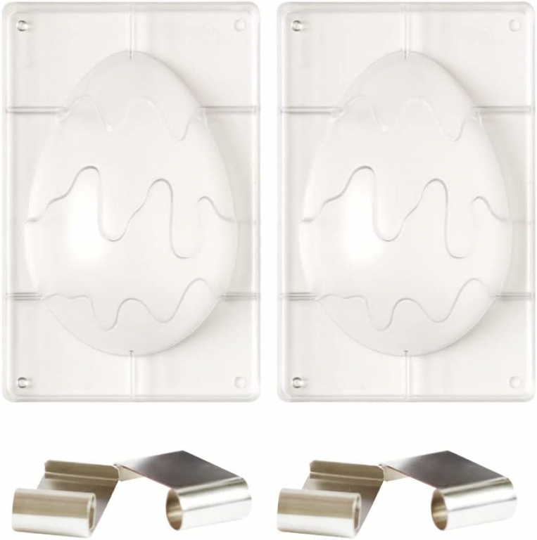 Kit composto da 2 stampi uova in policarbonato e 4 molle cromate ideali per realizzare uova al cioccolato con un solo passaggio. Allenati al volantino con un passo all'interno.