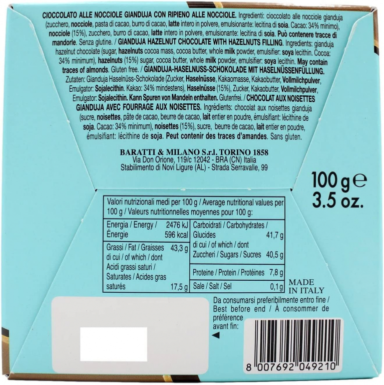 CIOCCOLATO ALLE NOCCIOLE GIANDUJA (ZUCCHERO, NOCCIOLE, PASTA DI CACAO, BURRO DI CACAO, LATTE INTERNO IN POLVERE, EMULSIONANTE: LECITINA DI SOIA. CACAO: 34% MINIMO), NOCCIOLE (15%), ZUCCHERO, BURRO DI CACAO, LATTE INTERO IN POLVERE, EMULSIONANTE: LECITINA DI SOIA. PUÒ CONTENERE TRACCE DI MANDORLE. SENZA GLUTINE.