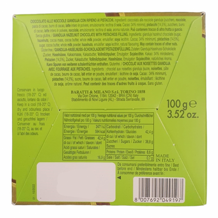 CIOCCOLATO ALLE NOCCIOLE GIANDUJA (ZUCCHERO, NOCCIOLE, PASTA DI CACAO, BURRO DI CACAO, LATTE INTERO IN POLVERE, EMULSIONANTE: LECITINA DI SOIA. CACAO: 34% MINIMO), PISTACCHI (14,5%), ZUCCHERO, BURRO DI CACAO, LATTE INTERO IN POLVERE, EMULSIONANTE: LECITINA DI SOIA, AROMA NATURALE. PUÒ CONTENERE TRACCE DI MANDORLE. SENZA GLUTINE.