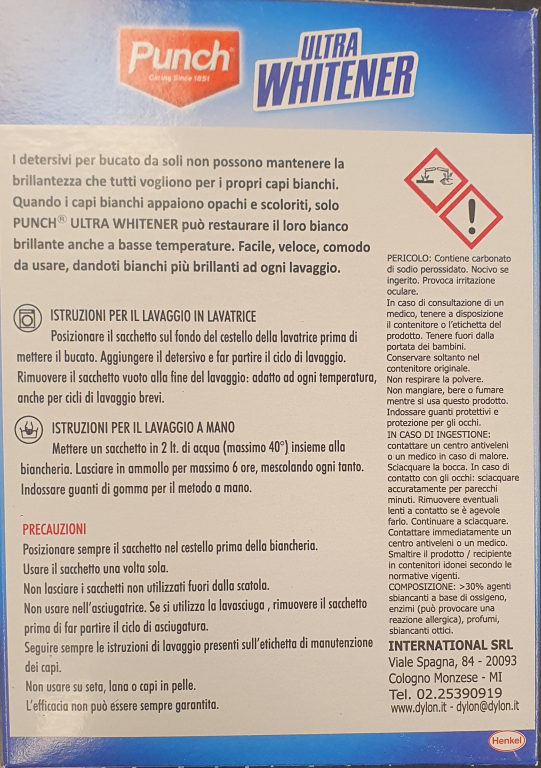 Punch Ultra Whitener è uno sbiancante intensivo per il bucato in bustine, formulato per ripristinare la brillantezza originale dei capi bianchi ingialliti o ingrigiti. La sua formula potente agisce in profondità sulle fibre, garantendo risultati visibili anche a basse temperature e rendendo i tessuti più luminosi ad ogni lavaggio. È l'alleato ideale per mantenere il bianco sempre perfetto.