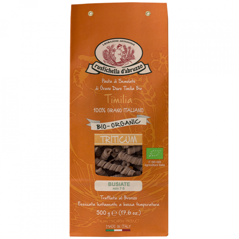 Simbolo della succulenta tradizione culinaria siciliana, le busiate sono un formato di pasta a forma di sottili tubi attorcigliati su sè stessi, una sorta di maccheroni. Il nome sarebbe riconducibile al “buso”, un particolare ferro da maglia che era solitamente utilizzato per lavorare tessuti come la lana e il cotone. Ma il termine potrebbe riferirsi anche alla busa, ovvero della “disa”, una graminacea tipica della macchia mediterranea che i contadini utilizzavano anticamente per legare i fasci di spighe. Le busiate Rustichella d'Abruzzo sono realizzate con la timilia, una delle varietà di grano antico che Rustichella si propone di recuperare per offrire una prospettiva più salutistica dello stare a tavola. Si prestano a essere condite con salsa di pomodoro e sughi di pesce.
