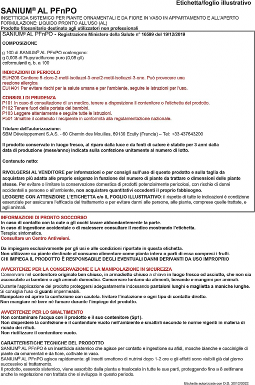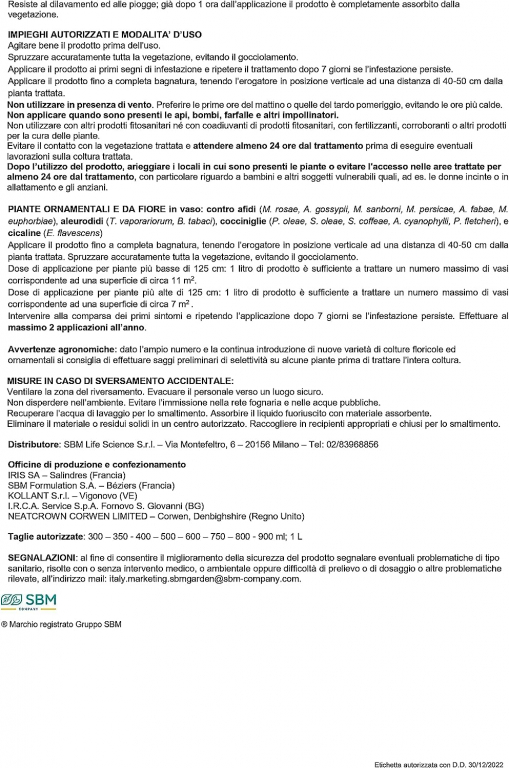 Tipologia: Insetticida sistemico liquido Pronto all'Uso (AL), specificamente formulato per Utilizzatori Non Professionali (PFnPO) su piante ornamentali e floreali.Principio Attivo: Flupyradifurone 0,08 g/L (0,008%). Questo è un principio attivo di nuova generazione (appartenente alla famiglia dei Butenolidi - IRAC 4D) efficace anche in caso di resistenza ai principi attivi tradizionali.Azione Sistemica e Meccanismo: