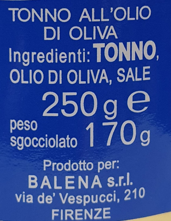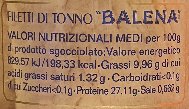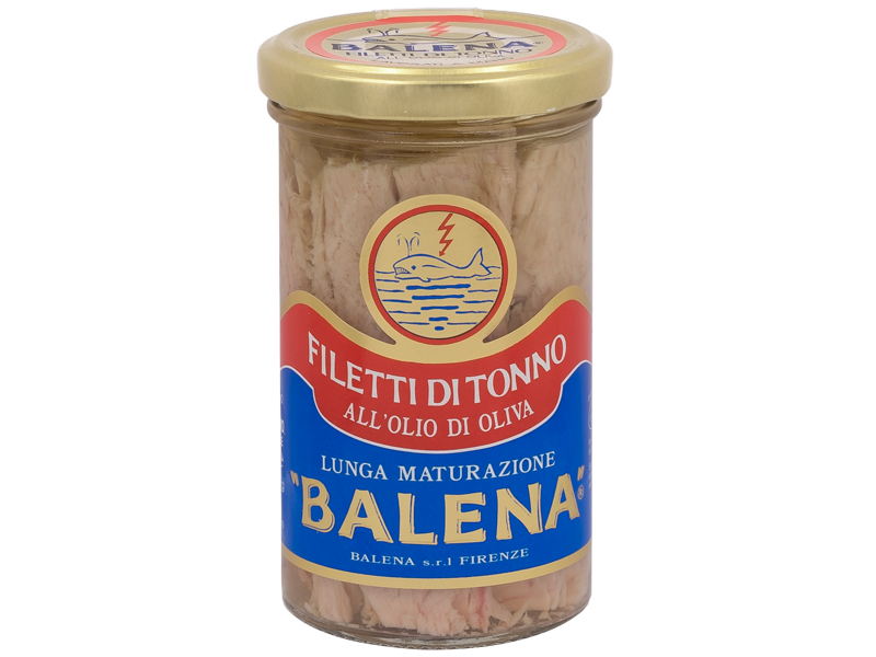 Produttore: Balena. Tipologia: Filetti di tonno in olio di oliva. Formato: Vaso in vetro da 250 g. Caratteristiche e Benefici: