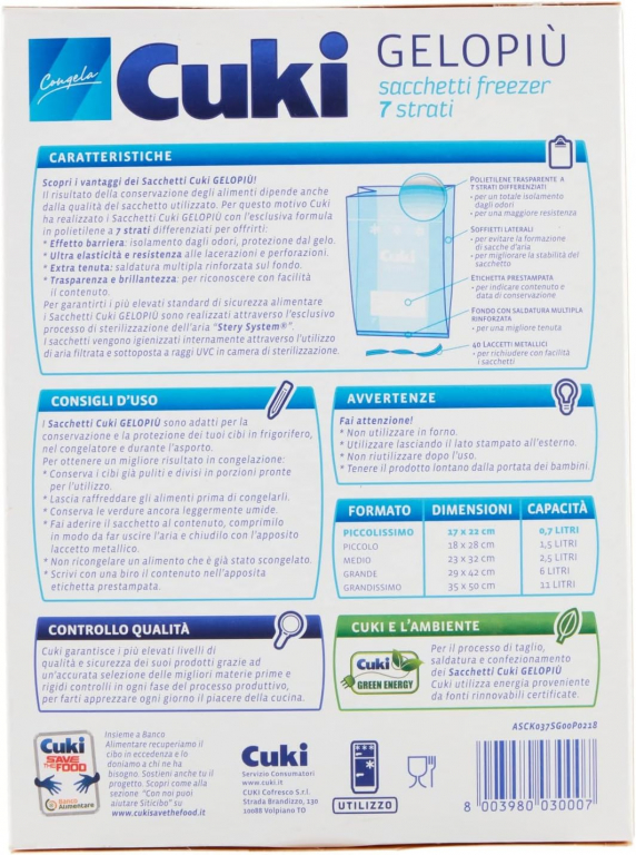 Una ricerca continua per un unico obiettivo: garantire ai tuoi cibi la miglior protezione, anche nel congelatore. Cuki Sacchetti Gelopiù sono igienizzati internamente mediante procedimento Stery System con aria filtrata e sottoposta a raggi UVC. Grazie ai 5 strati in polietilene ti offrono protezione dal gelo e dagli odori, più resistenza alle lacerazioni e un’ extra tenuta ineguagliabile.