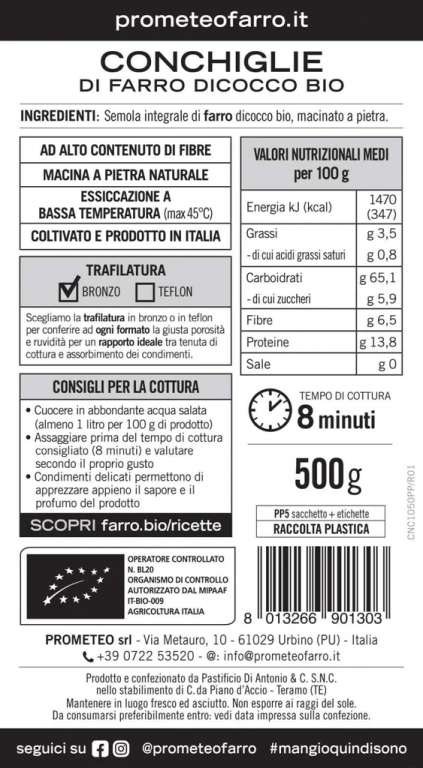 INGREDIENTI *semola integrale di farro dicocco macinata a pietra. (*) ingrediente biologico