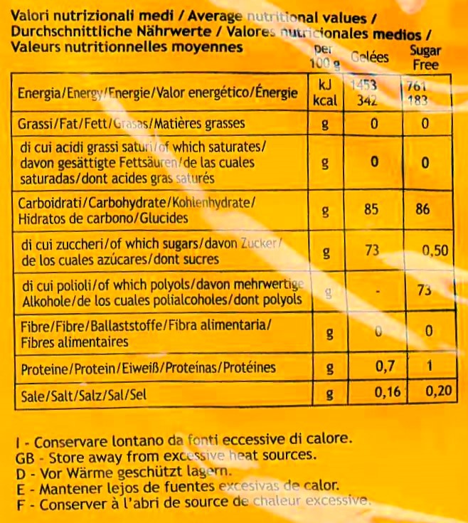 Ingredienti: zucchero, sciroppo di glucosio, acqua, acidificante acido citrico, gelificante pectina, aromi naturali, concentati vegetali (carota, carota nera, cartamo, ibisco, limone, patata dolce), senza glutine
