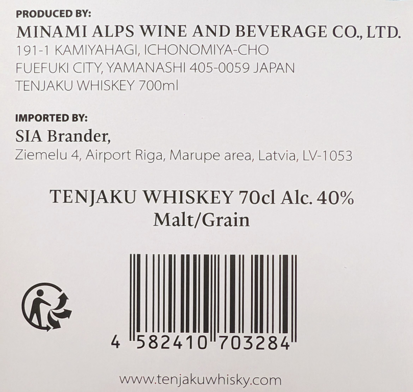 Guardando verso il monte Fuji e le Alpi Meridionali, rappresenta un luogo benedetto circondato da una natura sconfinata con foreste verdeggianti, splendidi frutteti, sorgenti termali e ruscelli cristallini. Il contenuto minerale moderato presente nell'acqua di questa zona, contribuisce alla realizzazione di un whisky liscio e facile da bere, dal sapore equilibrato, con natura leggermente alcalina. Il simbolo del Tenjaku, rappresentato sulla bottiglia, è l'allodola (hibari), amatissimo araldo della primavera nell'est e nell'ovest. Come il canto lieve e armonioso di questo piccolo uccello, così il sapore del Tenjaku whisky risulta piacevolmente puro e morbido.