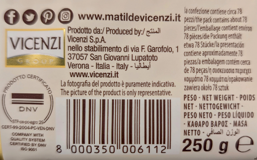 Zucchero, MANDORLE d’albicocca 18% (contiene SOLFITI), albume d’UOVO*, zucchero di canna 5%, MANDORLE** 1%, LATTOSIO, proteine del LATTE, agente lievitante (carbonato acido di sodio), aroma naturale.