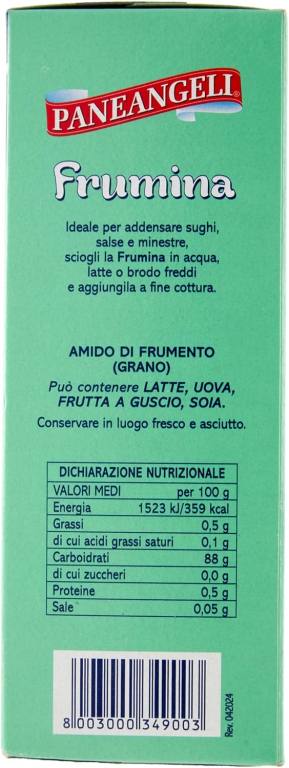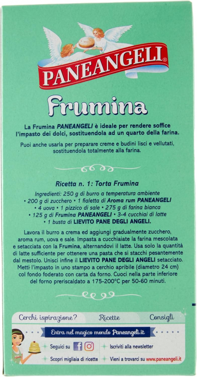 Amido di frumento di primissima qualità, la Frumina PANEANGELI consente di ottenere dolci di ricercata sofficità e friabilità con una lievitazione perfetta e di conferire a questi un gusto delicato. Sostituendo, infatti, nella preparazione di un dolce, una parte della farina con questo amido, si ottiene un impasto che durante la cottura e la lievitazione acquista un’ottimale porosità. Essa può inoltre essere sostituita alla farina per la preparazione di creme, mostarde e budini, ai quali dona una consistenza liscia e vellutata.